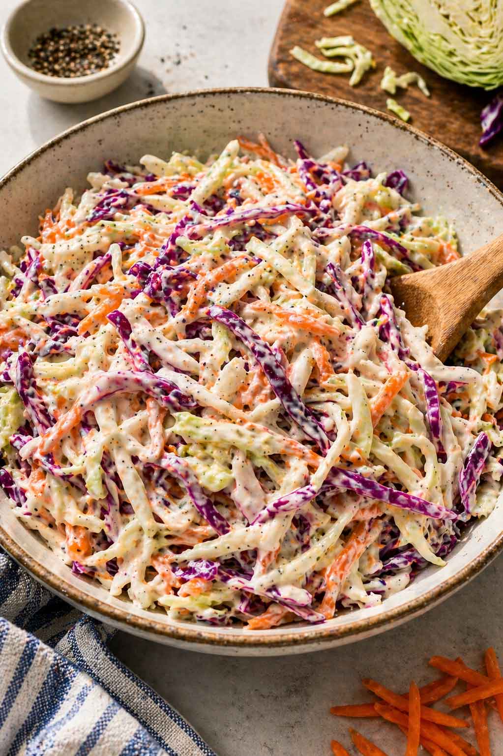 Ne hagyd túl sokáig állni. A coleslaw legjobb azonnal tálalás után, vagy legfeljebb két óra hűtőzés után. Ha előre szeretnéd elkészíteni, tartsd külön a dressinget és a zöldségeket, és csak tálalás előtt forgasd össze.