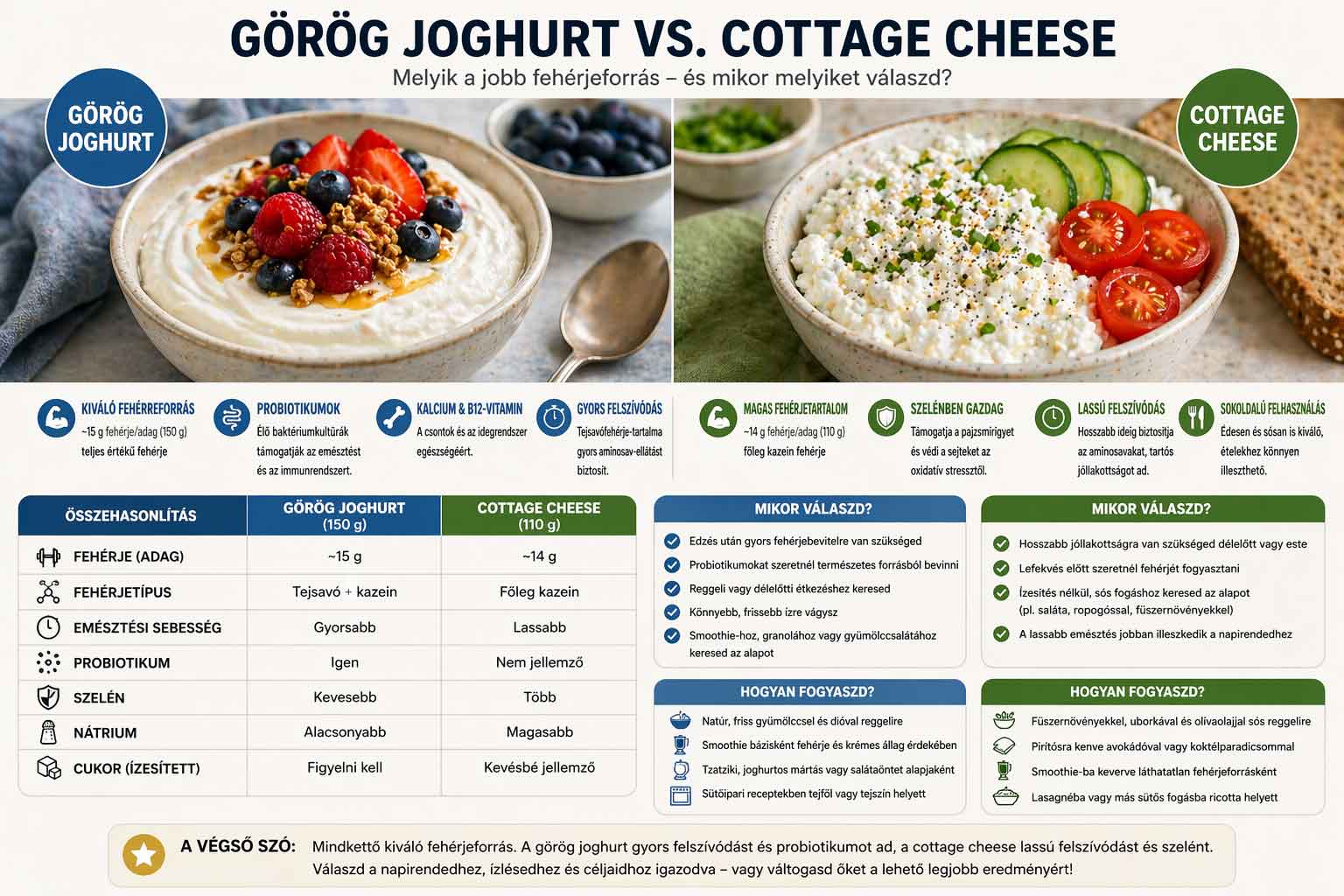 Aki gyors felszívódást, probiotikumot és könnyed reggeli alapot keres, a görög joghurt a jobb választás. Aki tartós telítettséget, lassabb emésztést és esti fehérjepótlást szeretne, a cottage cheese az erősebb jelölt. A legokosabb megoldás természetesen mindkettő – váltogatva, az adott nap igényeihez igazodva.