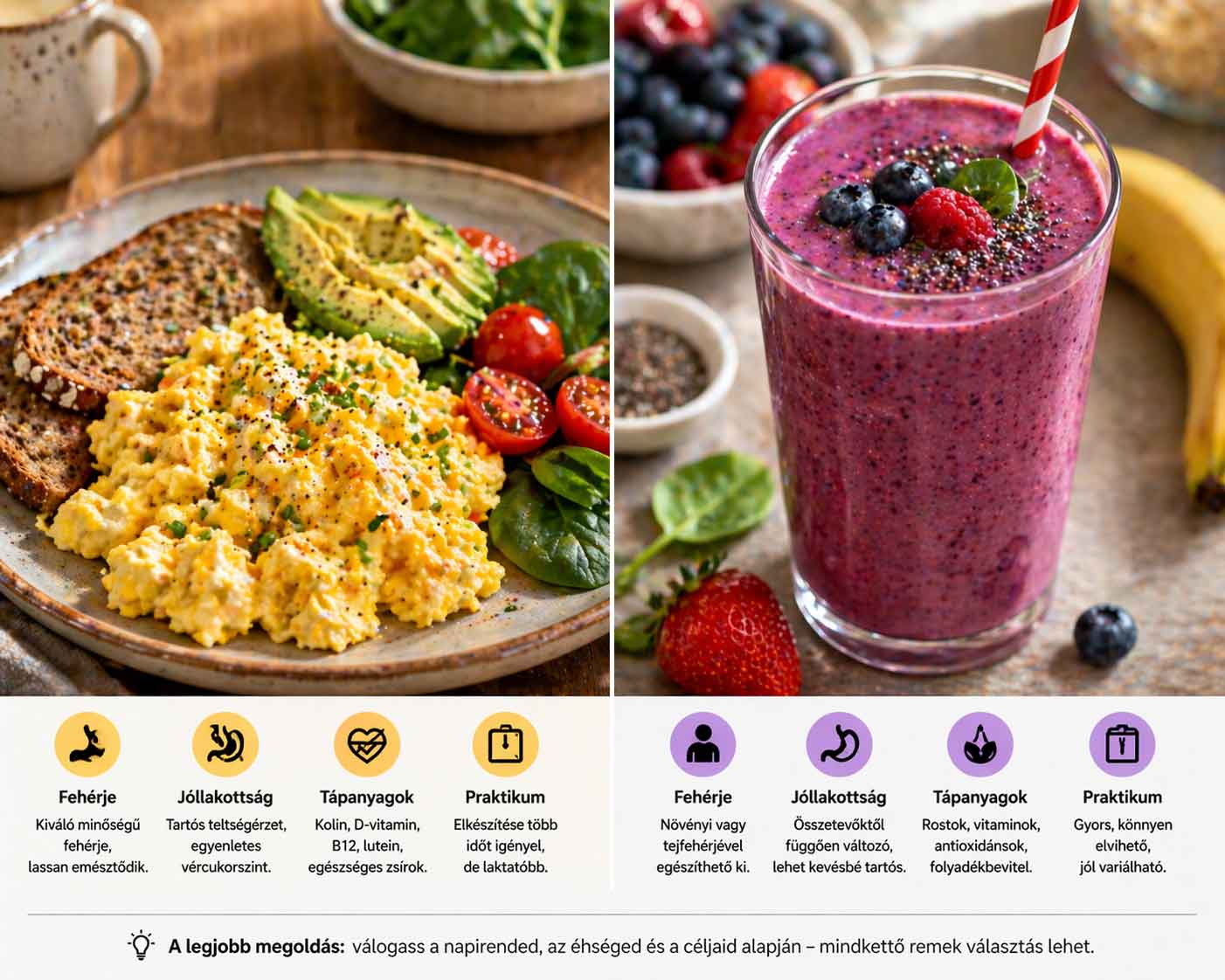 A tojás általában megbízhatóbban tölt jól. A szilárd ételt rágni kell, és ez önmagában is jelzést küld az agynak arról, hogy evés zajlik. A fehérje és zsír kombinációja ráadásul lassabban emésztődik, ami tartósabb telítettséget eredményez. Egy jól összerakott smoothie szintén képes jóllakottságot adni, de sokan számolnak be arról, hogy az ivott reggeli kevésbé érzi magát valódi étkezésnek.